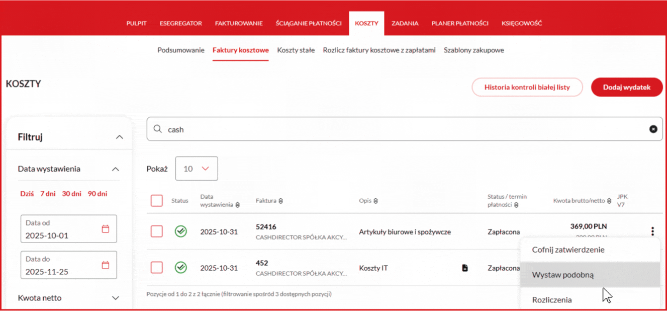 W sytuacji gdy konieczne jest zaksięgowanie faktury kosztowej od tego samego kontrahenta istnieje możliwość skorzystania z funkcji Wystaw podobną.