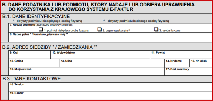 - B.1. Dane identyfikacyjne - wskaż dane identyfikacyjne podatnika lub podmiotu,