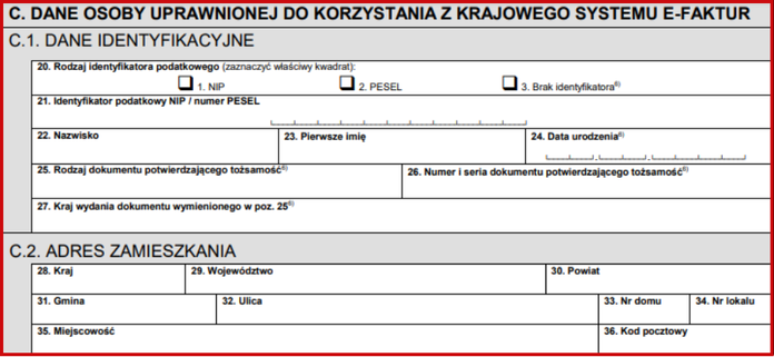 W części C należy uzupełnić dane osoby, która jest uprawniona do korzystania z KSeF.