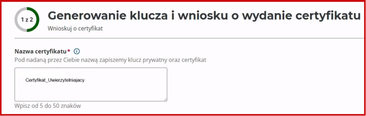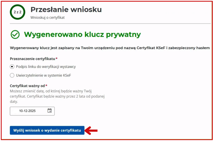 Na ekranie Generowanie klucza i wniosku o wydanie certyfikatu system wygeneruje dla Ciebie parę kluczy: