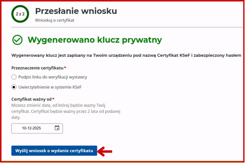 Uzupełnij również pole Certyfikat ważny od. Następnie kliknij Wyślij wniosek o wydanie certyfikatu.