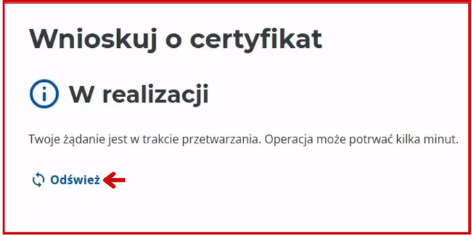 Po wypełnieniu kliknij Wyślij wniosek o wydanie certyfikatu — uruchomi to proces wydawania certyfikatu KSeF. Proces może potrwać kilka minut. Możesz użyć przycisku Odśwież, aby sprawdzić status.
