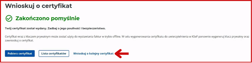 - Wnioskuj o kolejny certyfikat - umożliwi wygenerowanie kolejnego certyfikatu.