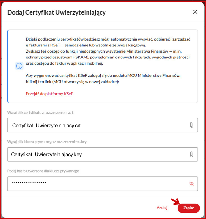 Wgraj certyfikat w formacie .crt, który został wygenerowany w Module Certyfikatow i Uprawnień z przeznaczeniem certyfikatu do Uwierzytelnienia w systemie KSeF. Załącz klucz prywatny w formacie .key. Wprowadź również Hasło do klucza prywatnego, które zostało zdefiniowane podczas generowania certyfikatu oraz zapisz zmiany.