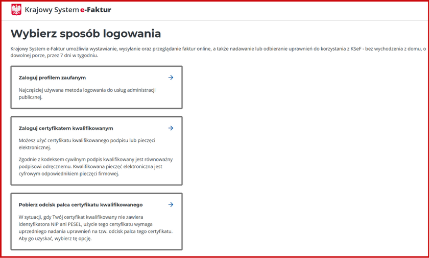 Uwaga: Logowanie może nastąpić przy użyciu Profilu Zaufanego, Certyfikatu kwalifikowanego lub odcisku palca certyfikatu kwalifikowanego.