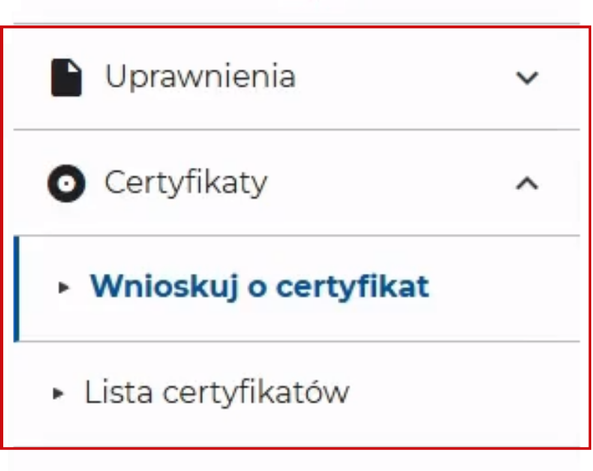 3. Przejdź do sekcji Certyfikaty, która znajduje się w głównym menu. Wybierz podzakładkę Wnioskuj o certyfikat.
