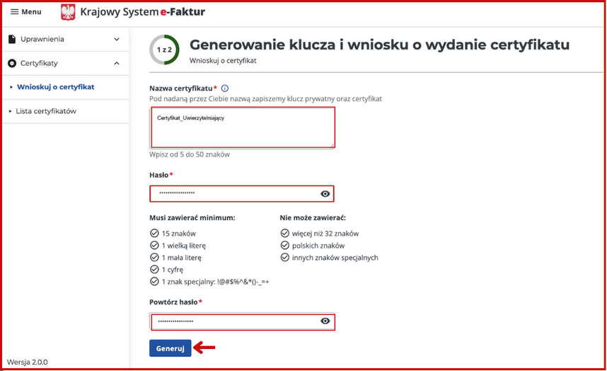 9. Wypełnij dane certyfikatu. Wymagane jest wprowadzenie Nazwy certyfikatu oraz utworzenie Hasła, które będzie zabezpieczać klucz prywatny oraz Powtórz hasło. Wybierz opcję Generuj. Klucz prywatny zostanie automatycznie zapisany na Twoim urządzeniu jako plik z rozszerzeniem .key.