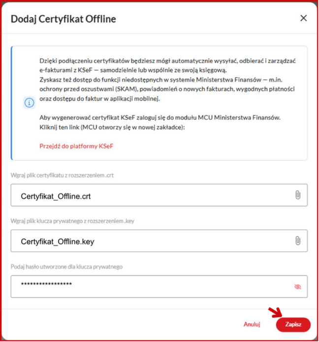 Wgraj certyfikat w formacie .crt, który został wygenerowany w Module Certyfikatow i Uprawnień z przeznaczeniem certyfikatu do Uwierzytelnienia w systemie KSeF. Załącz klucz prywatny w formacie .key. Wprowadź również Hasło do klucza prywatnego, które zostało zdefiniowane podczas generowania certyfikatu oraz zapisz zmiany.