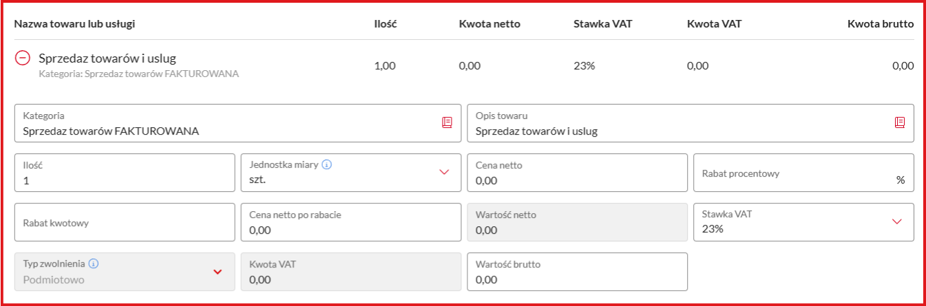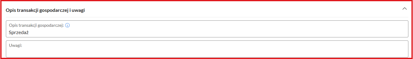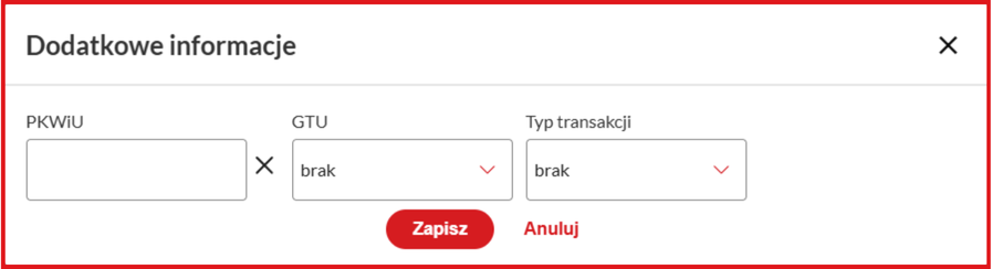 - uzupełnić kod PKWiU, GTU oraz typ transakcji (jeśli nie dotyczą - wybierz opcję brak, pole PKWiU pozostaw puste),