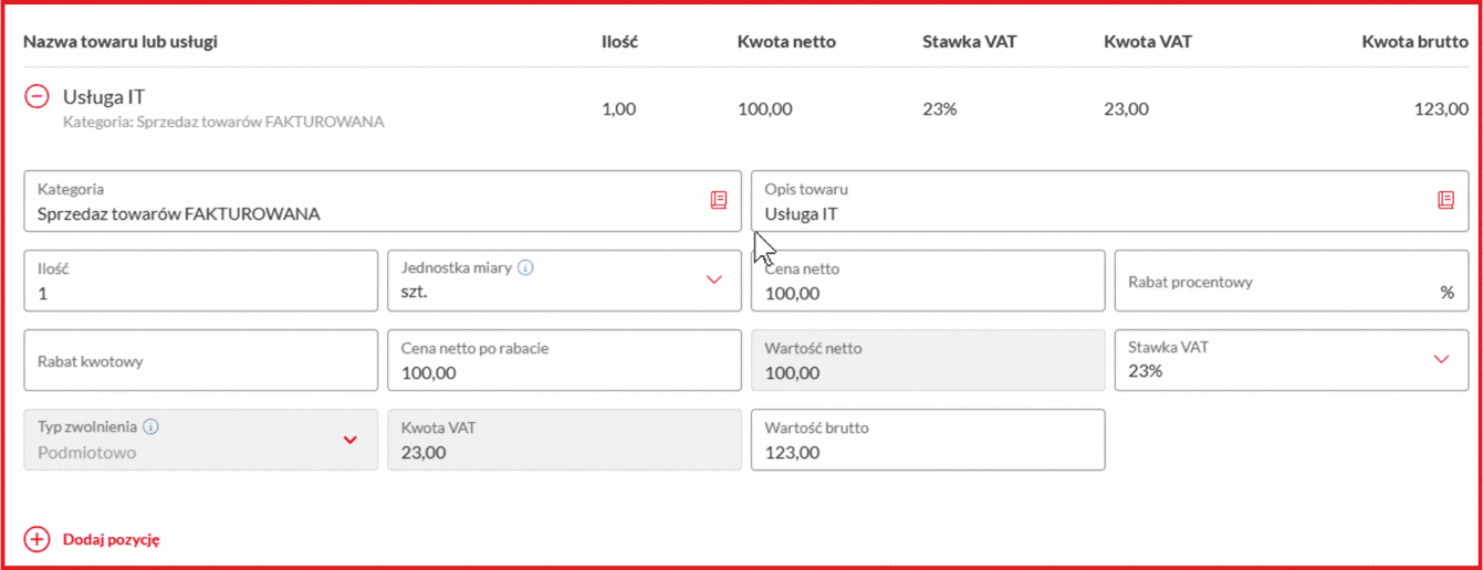 - uzupełnić pozycje dokumentu (opis, cena, ilość, stawka VAT),
