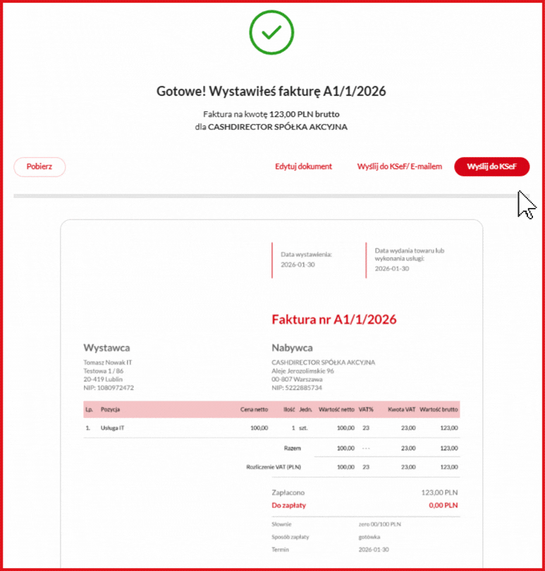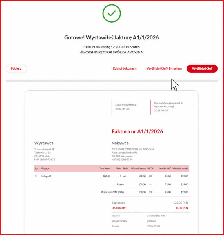 Po wystawieniu faktury otrzymasz komunikat sukcesu z informacją, że wystawiłeś fakturę.