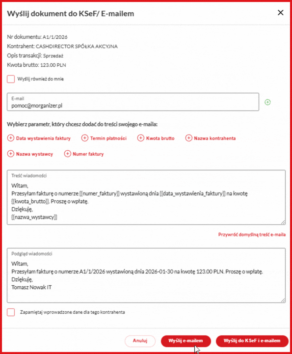 W celu wysłania faktury do kontrahenta w formie e-maila wybierz opcję Wyślij do KSeF/E-mailem.
