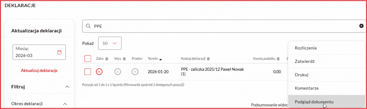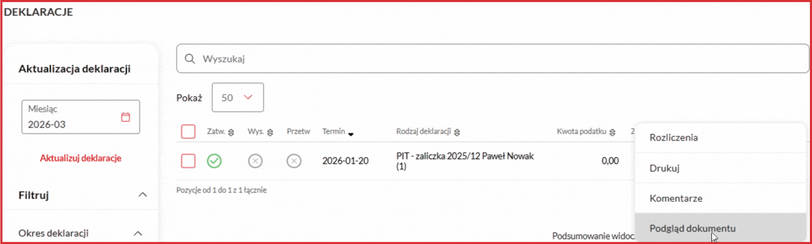Aby wyświetlić szczegóły, najedź na deklarację i wybierz Podgląd dokumentu.