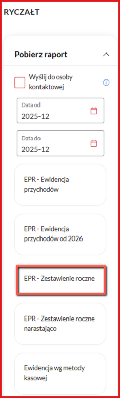 W zakładce Księgowość/Ryczałt, po lewej stronie wybierz opcję Pobierz raport. Ustaw okres 2025/12, a następnie wybierz EPR – Zestawienie roczne.